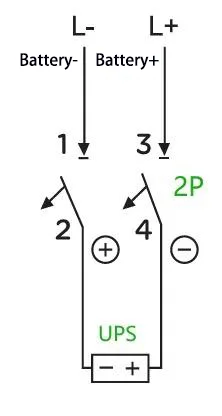 UN:Par exemple : pour un onduleur d'une capacité de 40 kVA et une chaîne de batteries nominale de 32 cellules (tension de charge d'égalisation : 14 V × 32 = 448 V ; il existe également des batteries avec une tension de charge d'entretien de seulement 13,6 V, utilisée ici à des fins d'illustration uniquement), le courant de fonctionnement maximum est calculé comme suit : 40 kVA × 1,0 ÷ 90 % ÷ 10 V ÷ 32 = 139 A. (en supposant un facteur de puissance de 1,0, un rendement de 90 % et une tension de coupure définie par l'onduleur de 10 V par cellule). Dans ce cas, un disjoncteur 2P 500 V 200 A suffit. La méthode de câblage est la suivante :