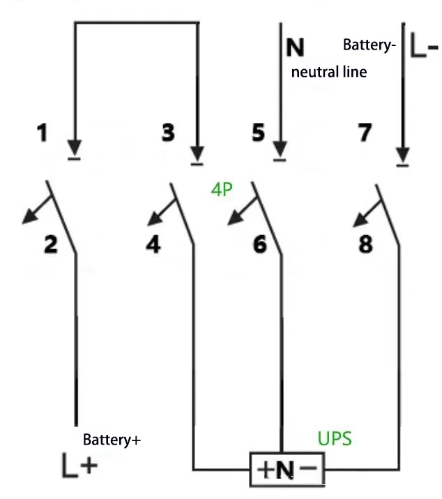E :Par exemple : pour un onduleur d'une capacité de 40 kVA, une chaîne de batteries nominale de 40 cellules et une connexion par fil neutre (tension de charge d'égalisation : 14 V × 40 = 560 V, soit ±280 V), le courant de fonctionnement maximum est calculé comme suit : 40 kVA × 1,0 ÷ 90 % ÷ 10 V ÷ 40 = 111 A. A 4P 750 V Un disjoncteur de 150 A peut être adopté, avec deux de ses pôles connectés en série. La méthode de câblage est la suivante :